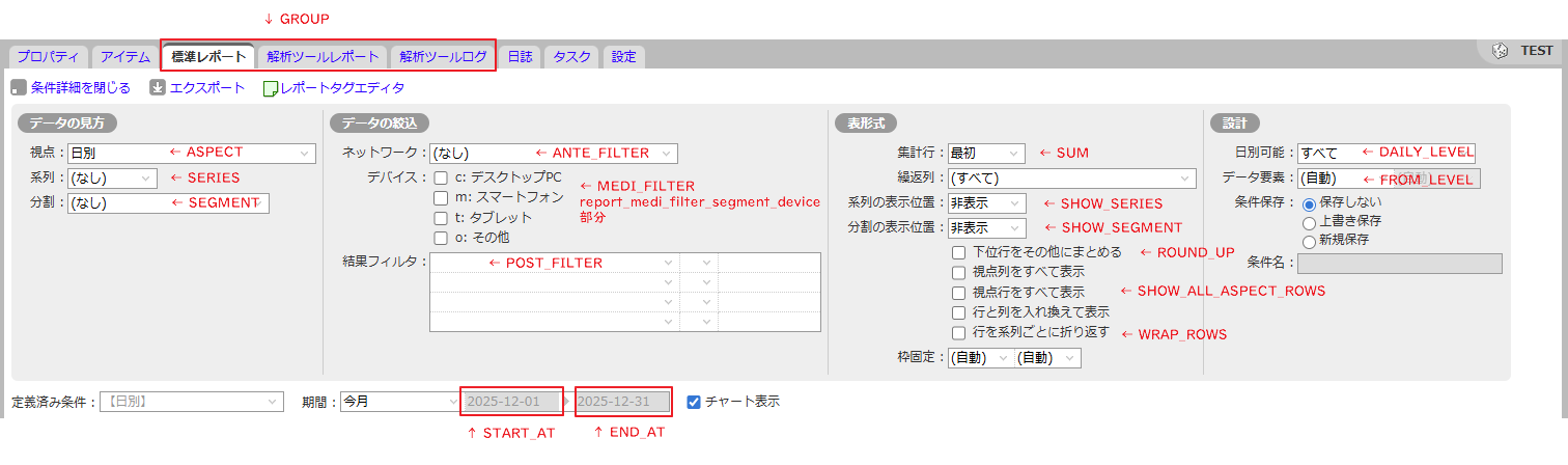 条件詳細で指定した内容は、レポートの[再表示]後、[レポートタグエディタ] > [現在のレポートデータ]に反映されます。