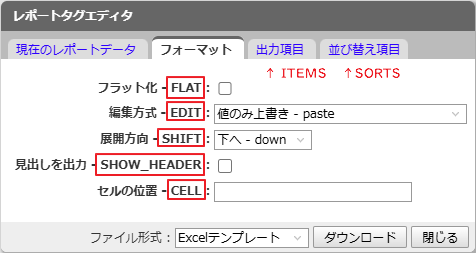レポートタグエディタからタグをダウンロードする方法は以下をご参照ください。